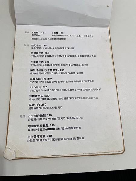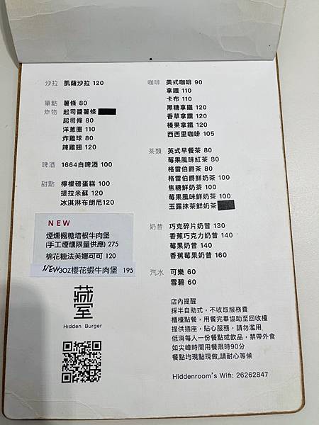 「藏室」的菜單可以看到他們的多種口味的漢堡,價格都滿平價也不收服務費,若是+40元即可升級有飲品的套餐,+70元則多了炸物和飲品。除了漢堡之外他們還有沙拉、炸物、甜點以及飲品包含咖啡、茶類、奶昔與汽水。