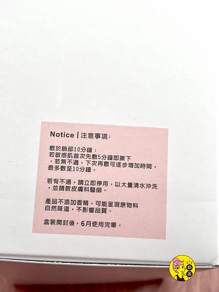包裝上也有面膜的注意事項和使用教學步驟,在使用前記得先清潔臉部,如果是一般不會敏感的肌膚可以敷10~15分鐘,如果是敏感肌只需3~5分鐘即可,所有的面膜都一樣,若使用後有任何不適都要立刻停止用水沖洗並且請教專業的醫師詢問唷。膚淺面膜也是強調不添加香精,所以敏弱肌也適用!