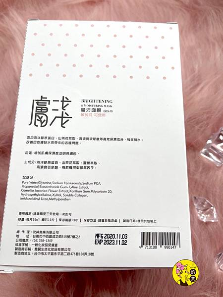 膚淺晶沛面膜外觀是白底配粉色點點,很清新舒服的包裝,包裝上頭也有清楚的面膜成份(包含海洋膠原蛋白、山茶花萃取、蘆薈萃取、高濃度玻尿酸等)與說明,公司資訊、使用日期也都很清楚,使用起來才能安心無疑慮,一盒十片裝開封後建議半年內盡速使用完畢唷。